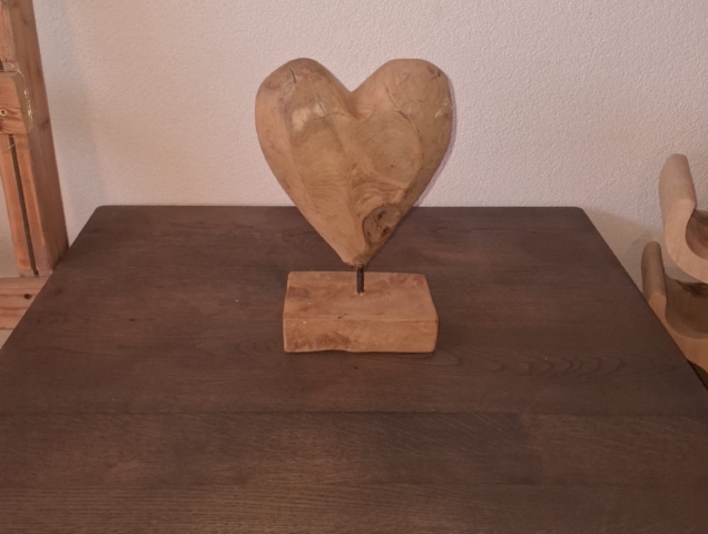Decoratief hart gemaakt van massief teakhout. Elk exemplaar is uniek door de natuurlijke houtnerf en kleurnuances. Staat stevig op een houten voet en past perfect in elk interieur. Ook mooi als symbolisch cadeau.