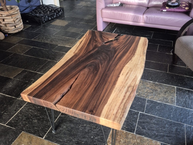 Deze prachtige salontafel is gemaakt van een massief stuk hout met een unieke en natuurlijke houttekening. De combinatie van de warme houtkleuren en de moderne metalen hairpin poten geeft de tafel een stoere en stijlvolle uitstraling.
